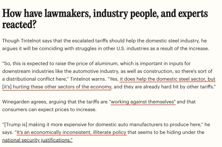 瓦恩加登也认为这些关税政策自相矛盾:“特朗普正在让美国汽车制造商的生产成本变得更高。这是一种在经济上不一致、不成熟的政策。”