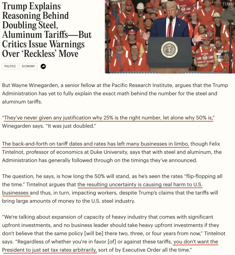 “他们(美国政府)从未解释过之前的25%为什么是合理税率,更不用说现在的50%了。税率就这么随随便便翻了一倍。”