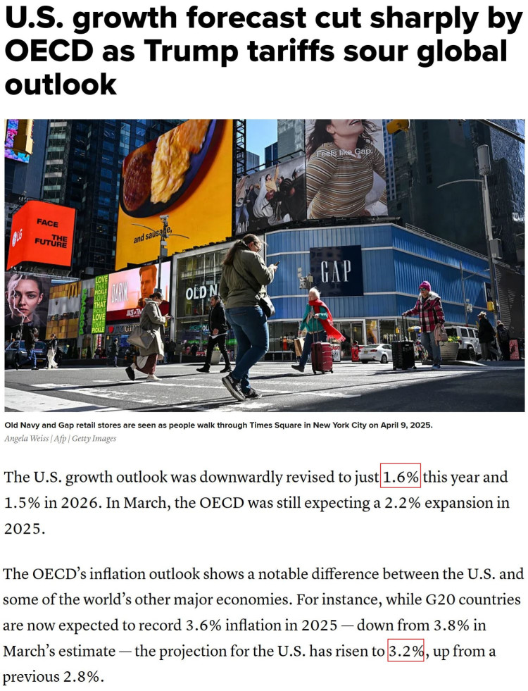 经济合作与发展组织(经合组织)3日发布的最新经济展望报告预计,在经贸政策不确定性等因素影响下,今年美国经济将仅增长1.6%,较3月预测值下调0.6个百分点,为增长放缓较为显著的主要经济体。