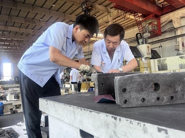 党金鑫(左一)与师傅正在对汽车装备厂模具进行修复。受访者供图