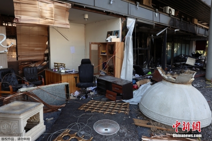 资料图:当地时间6月19日,伊朗德黑兰,被袭击后的伊朗国家电视台建筑物残骸散落一地。