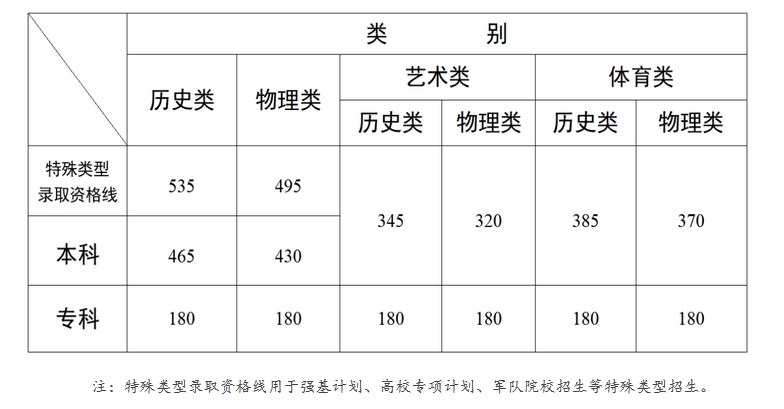 特殊类型录取资格线:物理组合483分;历史组合517分。