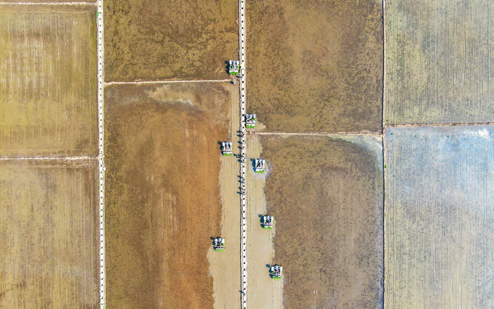 2022年5月13日,在辽宁省铁岭市铁岭县新台子镇,农民驾驶农机在稻田里插秧(无人机照片)。