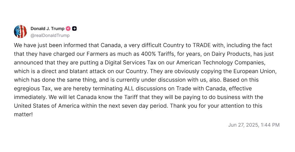 特朗普在“真实社交”上发文说:“我们刚刚得知,加拿大宣布要对美国技术公司征收数字服务税,这是公然对我们国家进行直接攻击。”