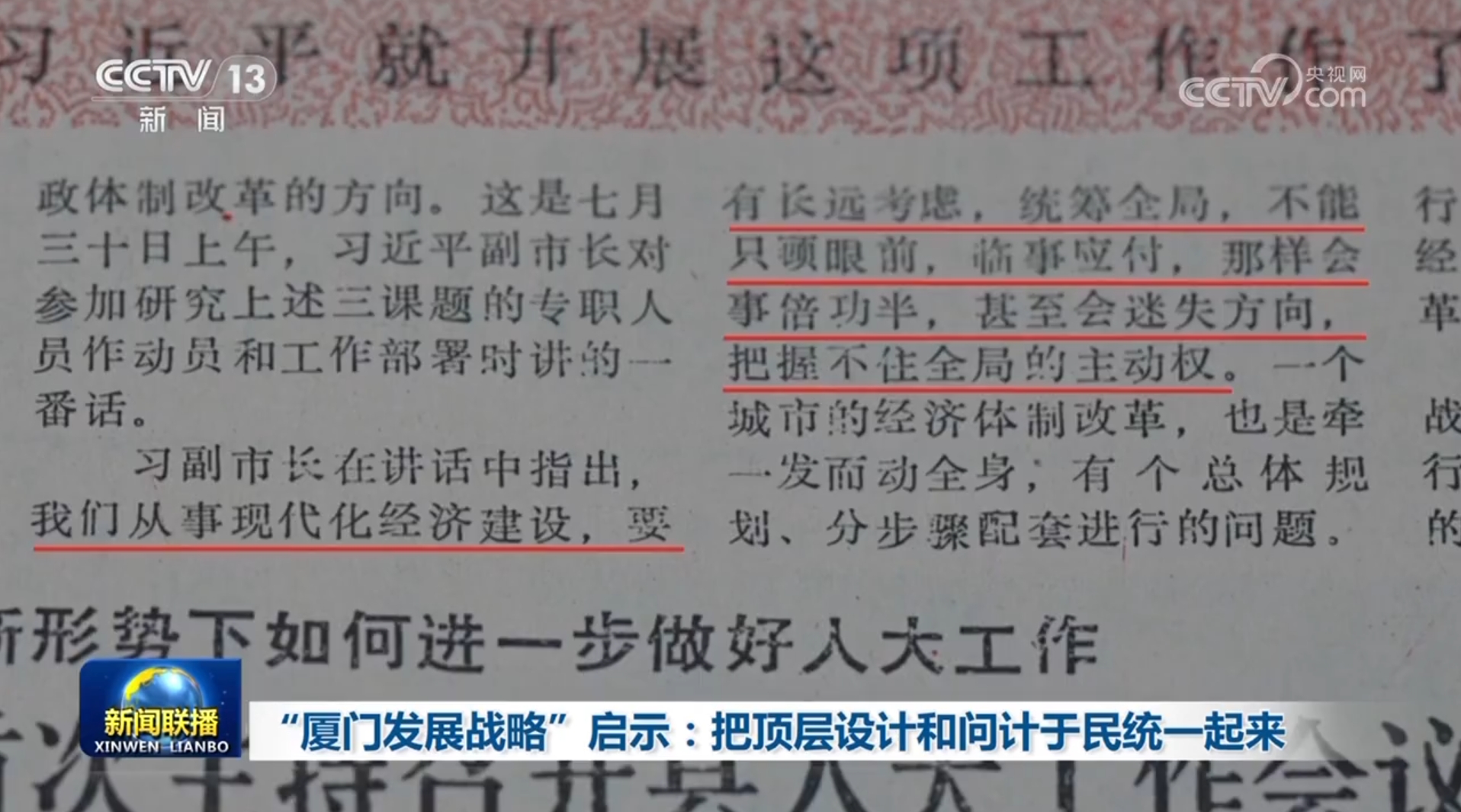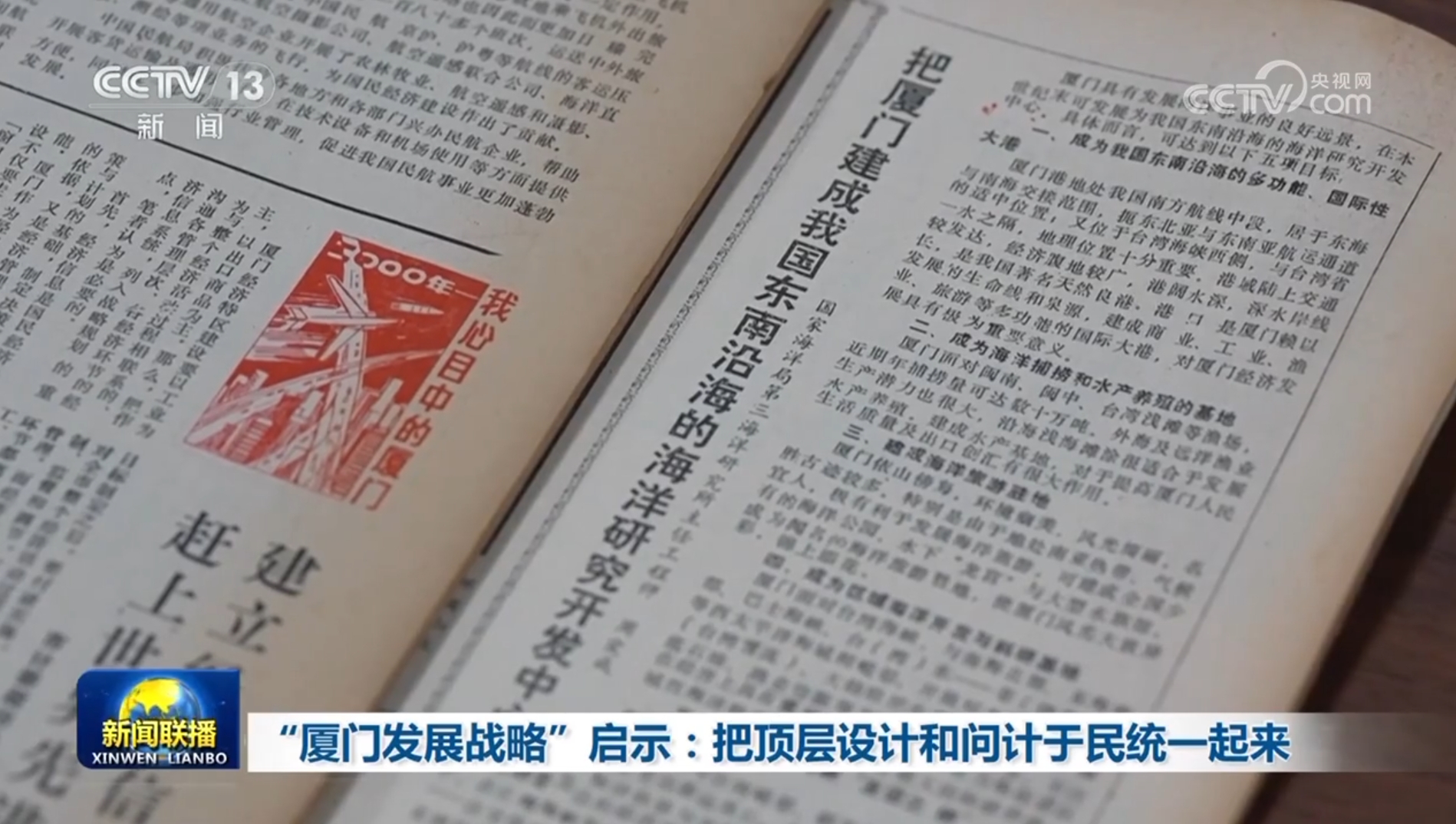 目前,党中央正在组织起草“十五五”规划建议。科学谋划“十五五”时期经济社会发展,对于全面落实党的二十大战略部署、推进中国式现代化意义重大。上世纪80年代,时任厦门市委常委、常务副市长的习近平同志历时一年半,牵头组织制定了《1985年—2000年厦门经济社会发展战略》(以下简称《厦门发展战略》),成为我国地方政府最早编制的一部纵跨15年的经济社会发展战略。30多年来,厦门接续奋斗,将蓝图变为美好现实。《厦门发展战略》成功实践所带来的诸多启示,对我们编制“十五五”规划有着重要的启示意义。《新闻联播》推出系列报道《“厦门发展战略”启示》,7月3日播出第一集《把顶层设计和问计于民统一起来》。