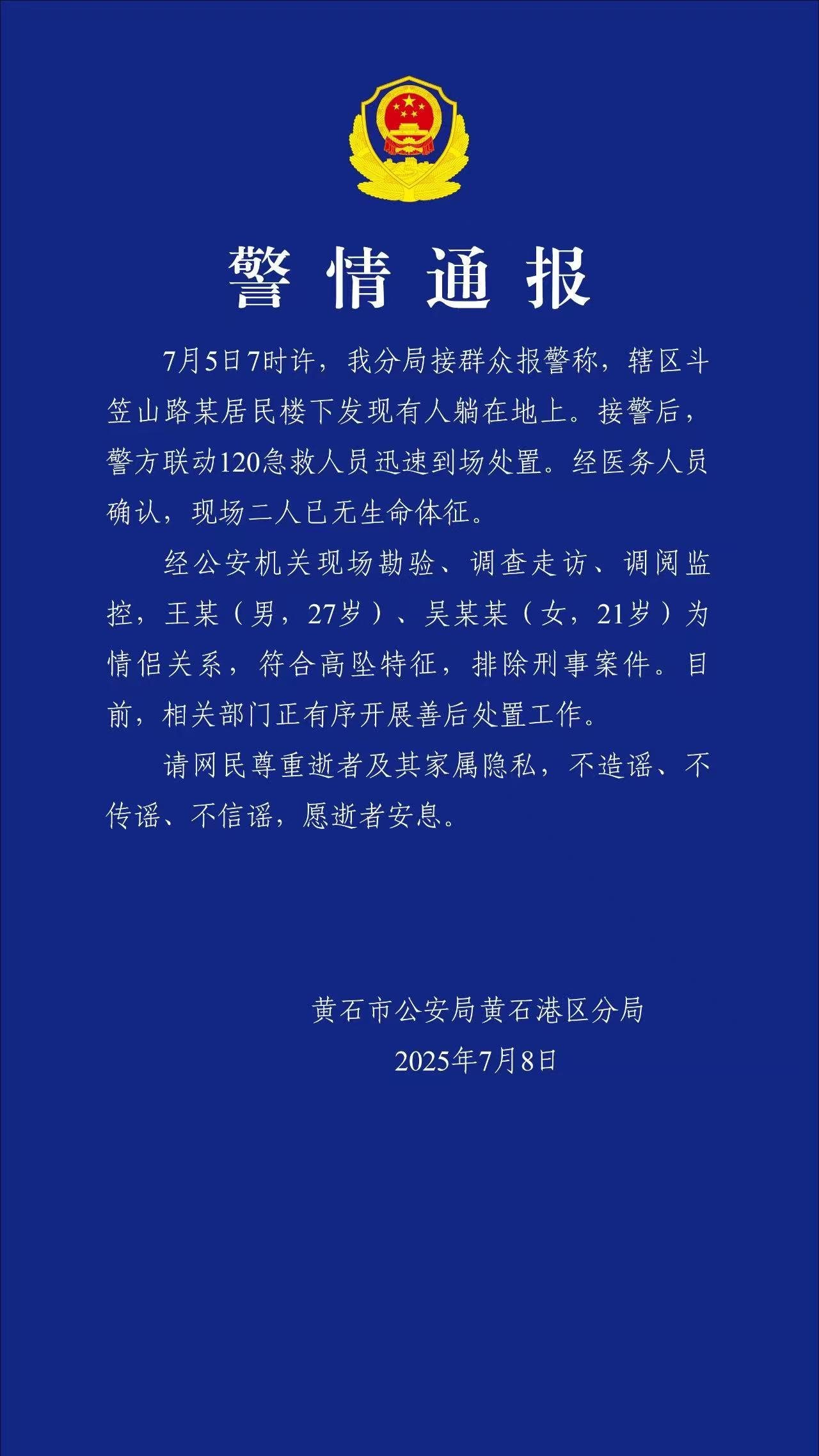 中国网7月8日讯 湖北省黄石市公安局黄石港区分局8日通报称,7月5日7时许,警方接群众报警称,辖区某居民楼下发现有人躺在地上。接警后,警方联动120急救人员迅速到场处置。经医务人员确认,现场二人已无生命体征。