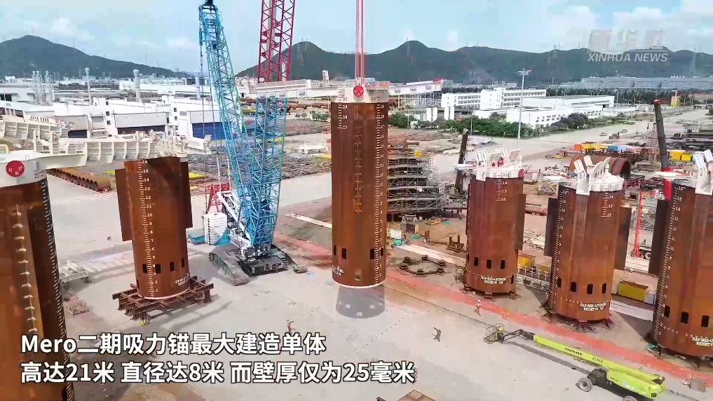 吸力锚是海洋工程关键装备,它利用负压工作原理,像大型吸盘一样牢牢吸附在海泥中,实现海洋设施高效固定,被誉为深远海能源开发的“定海神针”。吸力锚具有可高效安装、可回收复用、高承载力等突出优势,广泛应用于深水油气田、海上风电等领域。Mero二期吸力锚最大建造单体高达21米,直径达8米,而壁厚仅为25毫米,是典型的薄壁大直径筒体结构,对项目建造提出很大挑战。
