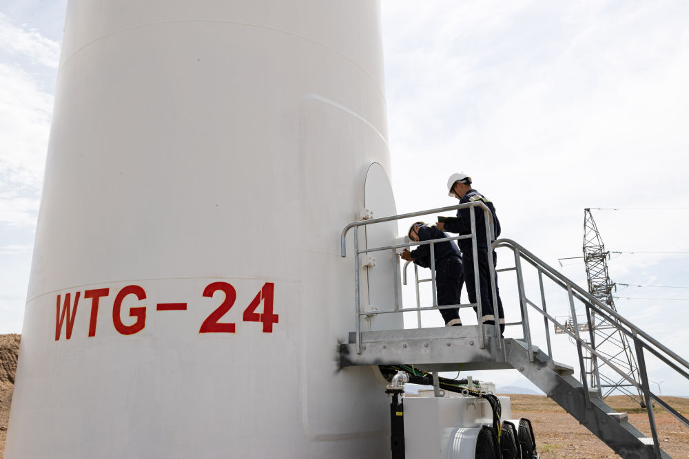 2024年6月25日,在哈萨克斯坦阿拉木图州谢列克风电场,工作人员准备打开风机塔筒门进行检查。新华社记者白雪骐摄