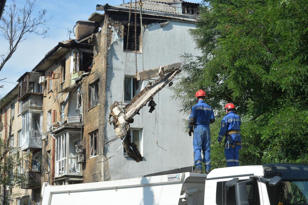 7月10日,在乌克兰基辅市舍甫琴科夫斯基区,救援人员拆除在空袭中受损的居民楼。新华社发(彼得·德鲁克摄)