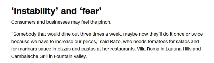 特雷莎・拉佐在美国加利福尼亚州经营着两家阿根廷-意大利风味餐厅,每天都需要用番茄制作沙拉以及用在披萨和意大利面里的番茄酱。她表示,如果关税导致番茄价格飙升,她的生意可能三个月后就会破产。