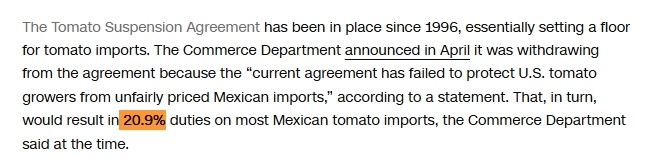 所谓“番茄协议”,是指美国与墨西哥1996年签署的《番茄暂停调查协议》。当时美国为平息贸易争端,同意暂停对墨西哥番茄的反倾销调查,条件是墨方必须按美国设定的“参考价格”对美出口番茄。此后双方一直定期重新谈判协议条款,最近一次续签协议是在2019年。
