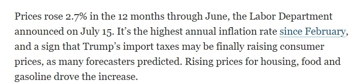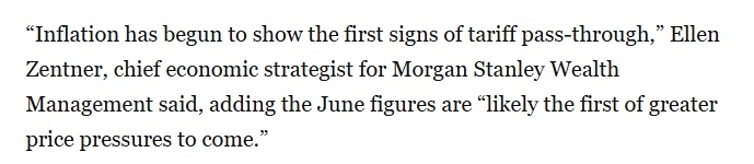 用摩根士丹利财富管理公司首席经济策略师艾伦•曾特纳的话说,“通胀已开始出现关税传导的初步迹象”,6月CPI数据“可能是未来更大价格压力的第一个信号”。