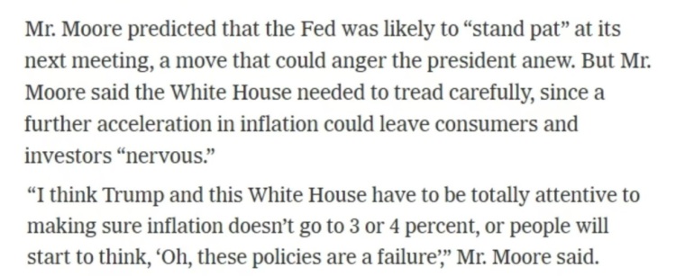 “我认为特朗普和这届政府必须集中精力确保通胀率不会达到3%或4%,否则人们会认为这些(关税等)政策是失败的。”