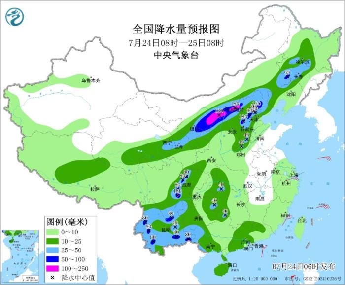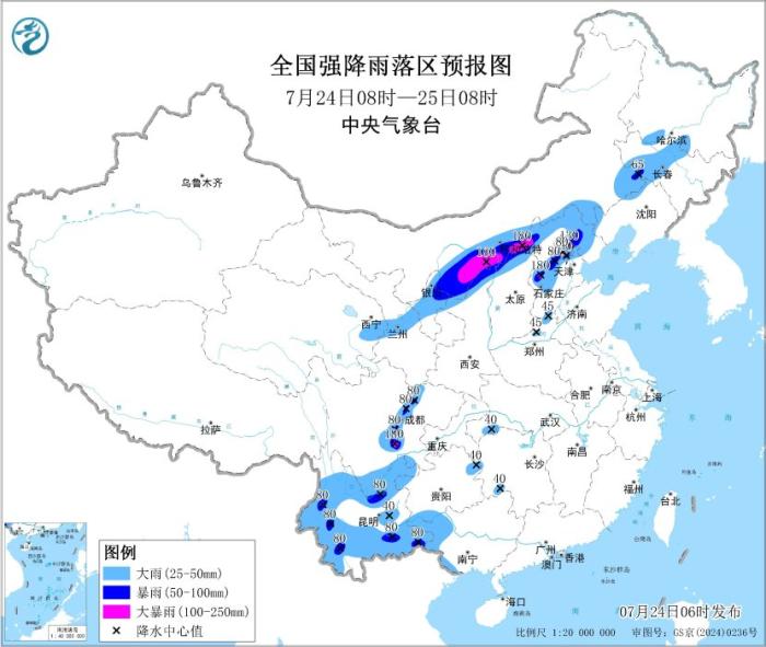 预计,7月24日08时至25日08时,内蒙古中西部偏南地区、宁夏中北部、陕西北部、山西北部、河北中北部、天津北部、北京中东部、河南东北部、四川南部和盆地西部、贵州东部和南部、湖北西南部、云南、广西西部以及青海东北部、甘肃东部、吉林中西部、黑龙江南部等地部分地区有大到暴雨,其中,内蒙古中西部偏南地区、山西北部、河北西部、北京东北部、四川盆地西南部等地局地有大暴雨(100~180毫米)。上述部分地区伴有短时强降水(最大小时降雨量20~50毫米,局地可超过70毫米),局地有雷暴大风等强对流天气(见图1)。中央气象台7月24日06时继续发布暴雨黄色预警。