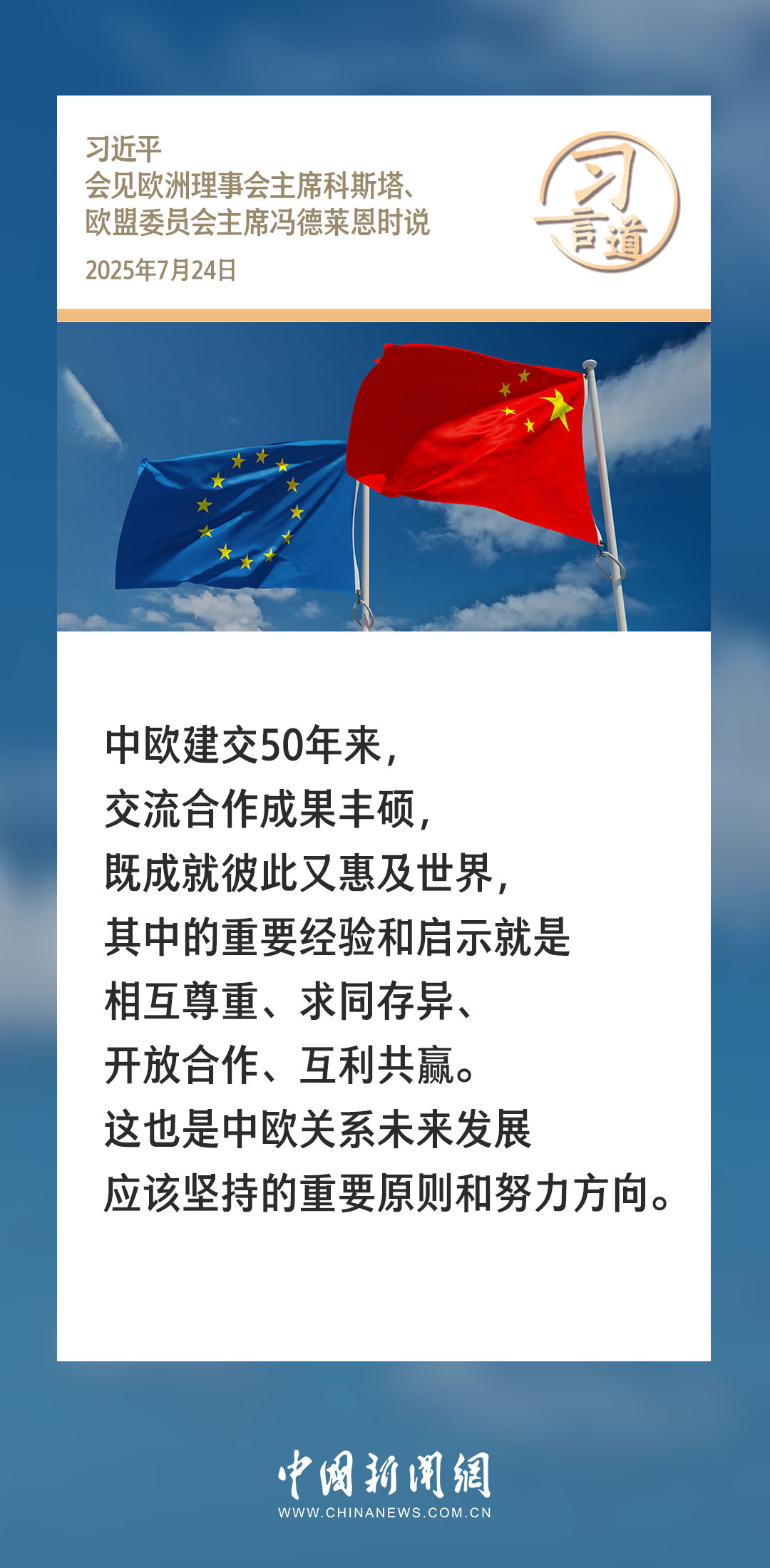7月24日,国家主席习近平在北京人民大会堂会见来华举行第二十五次中国-欧盟领导人会晤的欧洲理事会主席科斯塔和欧盟委员会主席冯德莱恩。习近平指出——