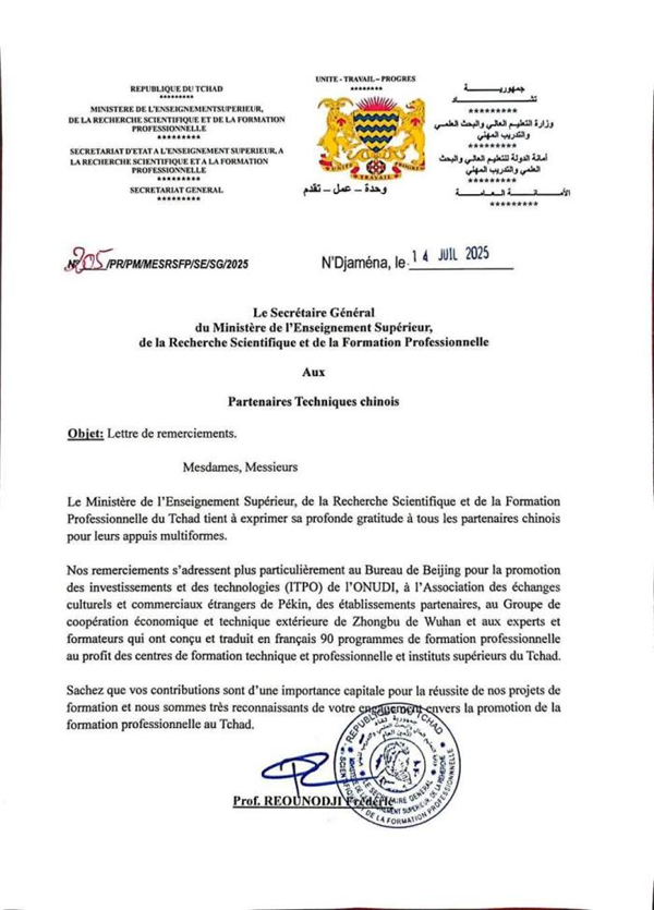 乍得高等教育、科研及职业培训部发布公告,向联合国工业发展组织投资和技术促进办公室(中国·北京)、北京对外文化贸易协会、中方合作院校、武汉中部对外经济技术合作集团有限公司以及参与职业标准开发与翻译的中方专家和教师致以诚挚感谢。