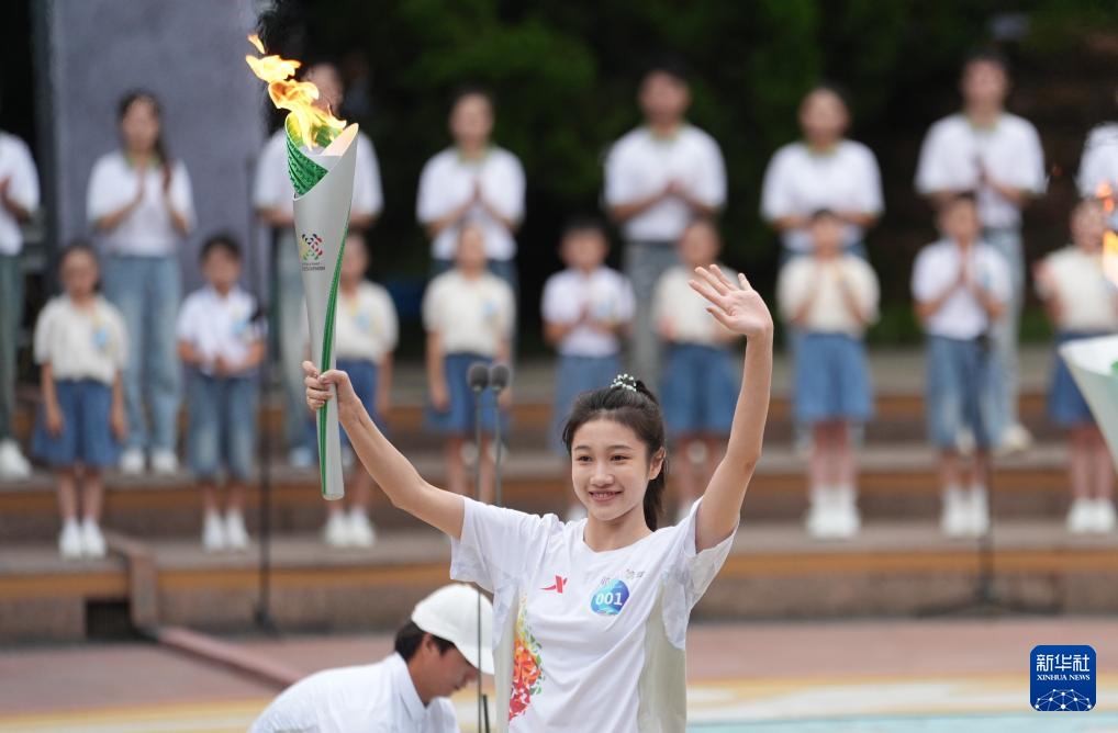 7月26日,第一棒火炬手黄张嘉洋在传递火炬。新华社记者 江宏景 摄