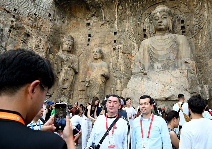 7月26日,上海合作组织媒体智库峰会与会嘉宾在洛阳市龙门石窟合影留念。新华社记者 郝源 摄