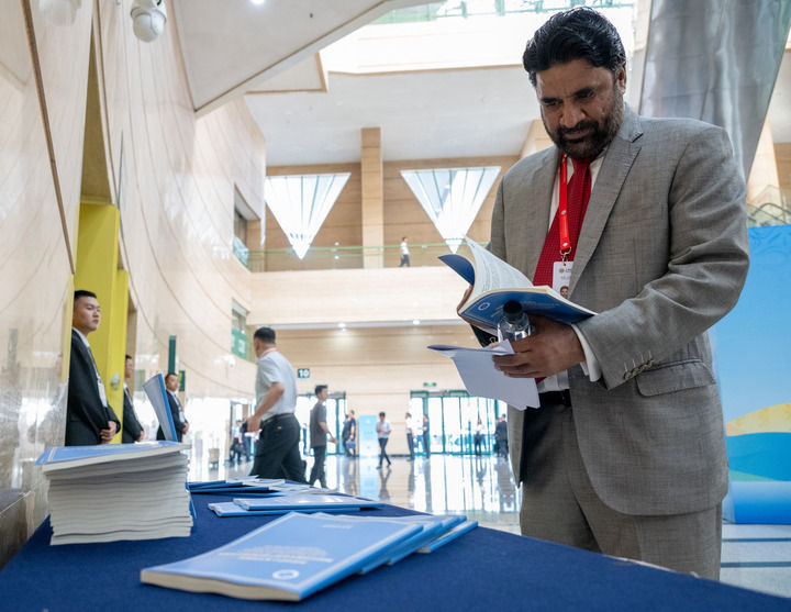 7月25日,与会代表在峰会会场翻阅《共同守护人类文明瑰宝——新时代中国文化遗产保护的理念与实践》智库报告。新华社记者 胡竞文 摄