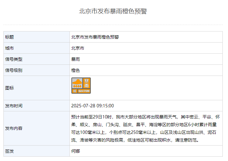 北京发布暴雨橙色预警:大部分地区将出现暴雨天气