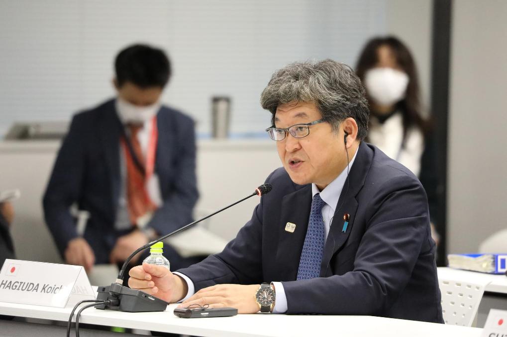 2020年9月24日,时任日本文部科学大臣萩生田光一在会议现场讲话。新华社记者杜潇逸摄