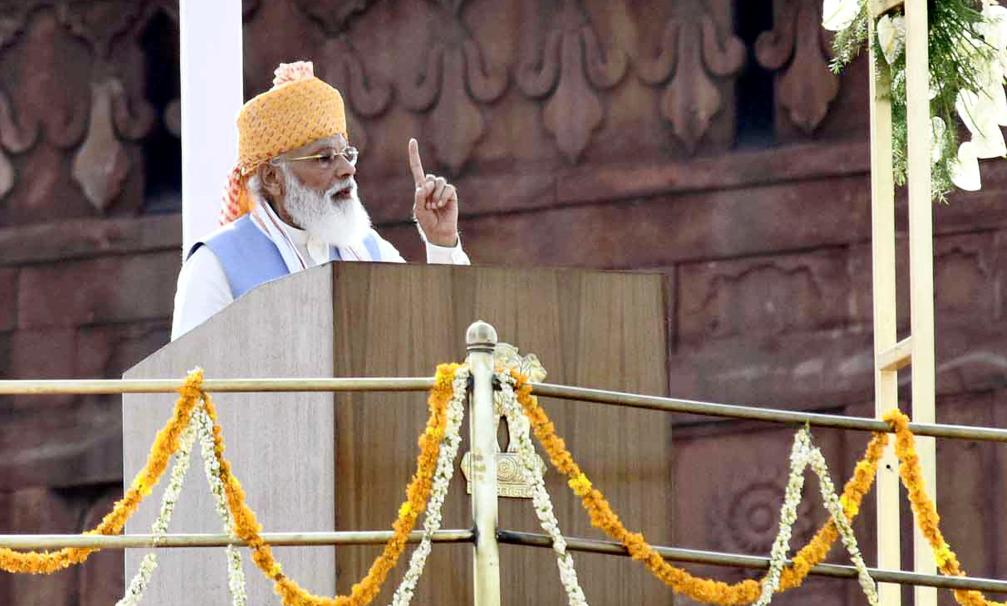 这是印度总理莫迪2021年8月15日在德里举行的独立日庆祝仪式上讲话的资料照片。新华社发(印度新闻局供图)