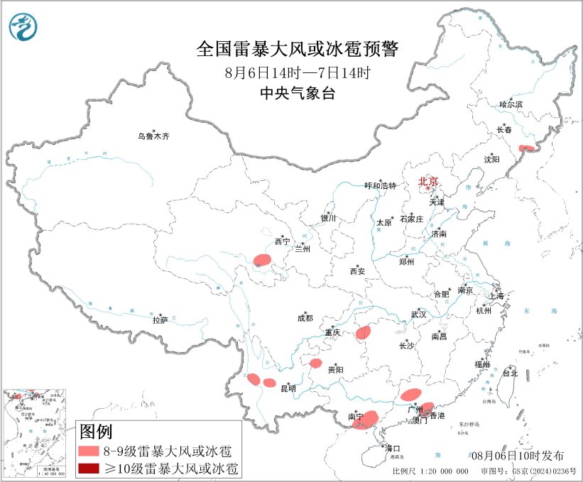 中国网8月6日讯 据中央气象台网站消息,中央气象台8月6日10时继续发布强对流天气蓝色预警:预计8月6日14时至7日14时,东北地区东部、黄淮、江汉、江南中西部、西南地区东部和南部、华南等地的部分地区将有小时雨量大于20毫米的短时强降水天气,其中,山东南部、河南东部和西南部、安徽北部、江苏北部、四川中东部、广西北部和东南部、广东西部等地的部分地区小时雨量大于50毫米,最大可达80毫米以上;吉林东南部、青海东南部、重庆东南部、贵州西北部、云南西部、广西东南部、广东中南部等地的部分地区将有8级以上雷暴大风或冰雹天气。