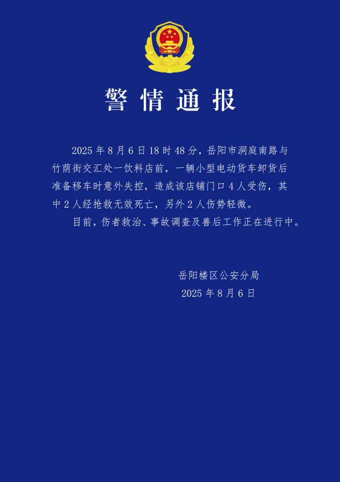 中国网8月7日讯 据湖南岳阳楼区公安分局微信公众号发布警情通报:8月6日18时48分,岳阳市洞庭南路与竹荫街交汇处一饮料店前,一辆小型电动货车卸货后准备移车时意外失控,造成该店铺门口4人受伤,其中2人经抢救无效死亡,另外2人伤势轻微。目前,伤者救治、事故调查及善后工作正在进行中。