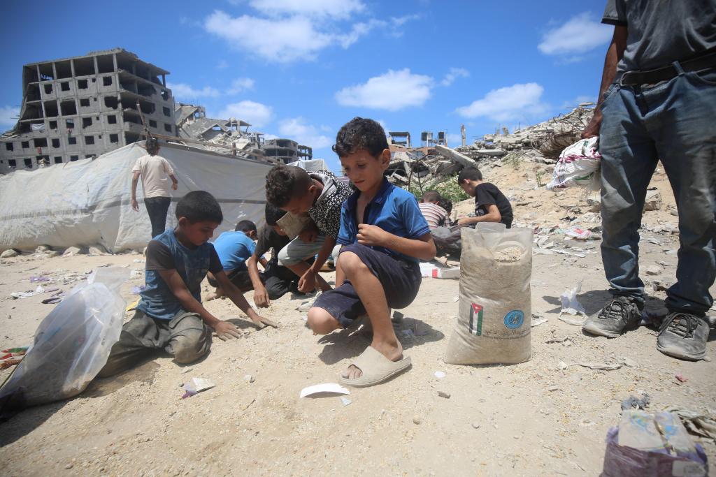 8月7日,孩子们在加沙城北部的空投地点捡取散落的食物。新华社/西霸
