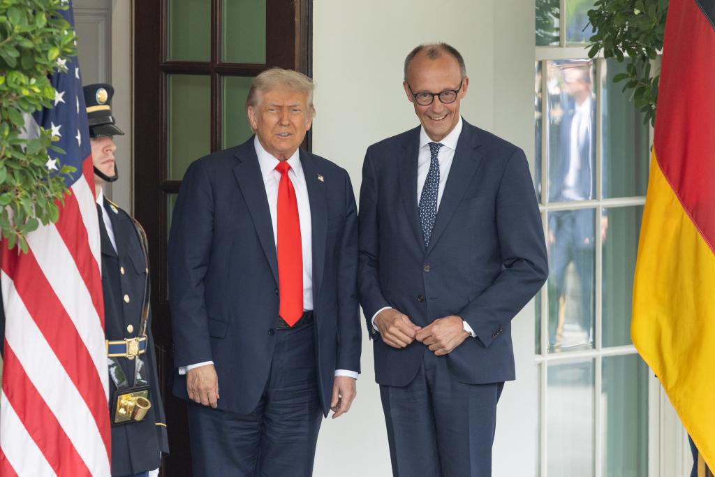 6月5日,美国总统特朗普在华盛顿白宫迎接到访的德国总理默茨。新华社记者胡友松 摄