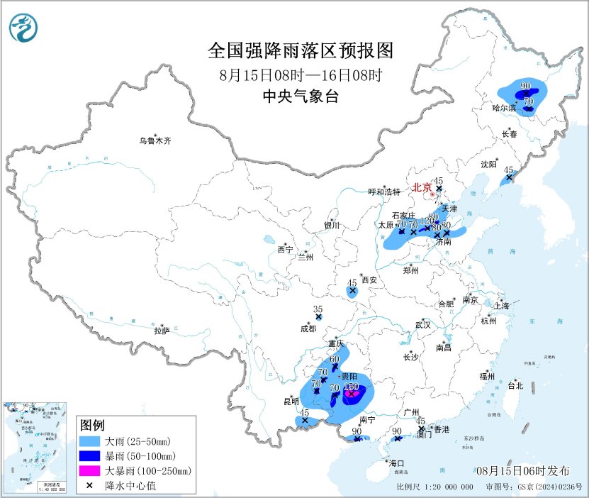 预计,8月15日08时至16日08时,黑龙江中南部、辽宁东部、北京东北部、河北南部、天津中南部、山西中部、陕西南部、贵州中西部和南部、云南东部、广西西部和南部沿海、广东西南部沿海等地部分地区有大到暴雨,其中,贵州南部、广西西北部、河北南部等地局地有大暴雨(100~150毫米)。上述部分地区伴有短时强降水(最大小时降雨量20~50毫米,局地可超过70毫米),局地有雷暴大风或冰雹等强对流天气。