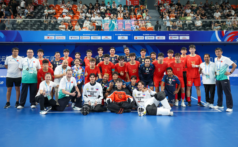 8月12日,中国队与菲律宾队球员、教练在2025年成都世运会软式曲棍球男子第7名争夺赛后合影。