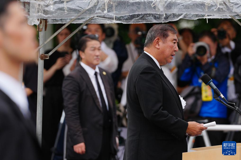 8月9日,日本首相石破茂在长崎举行的遭原子弹轰炸纪念仪式上发言。新华社记者 贾浩成 摄