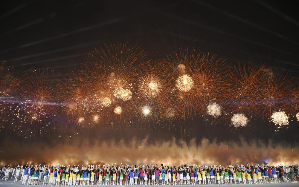 这是8月7日拍摄的开幕式上的焰火表演。