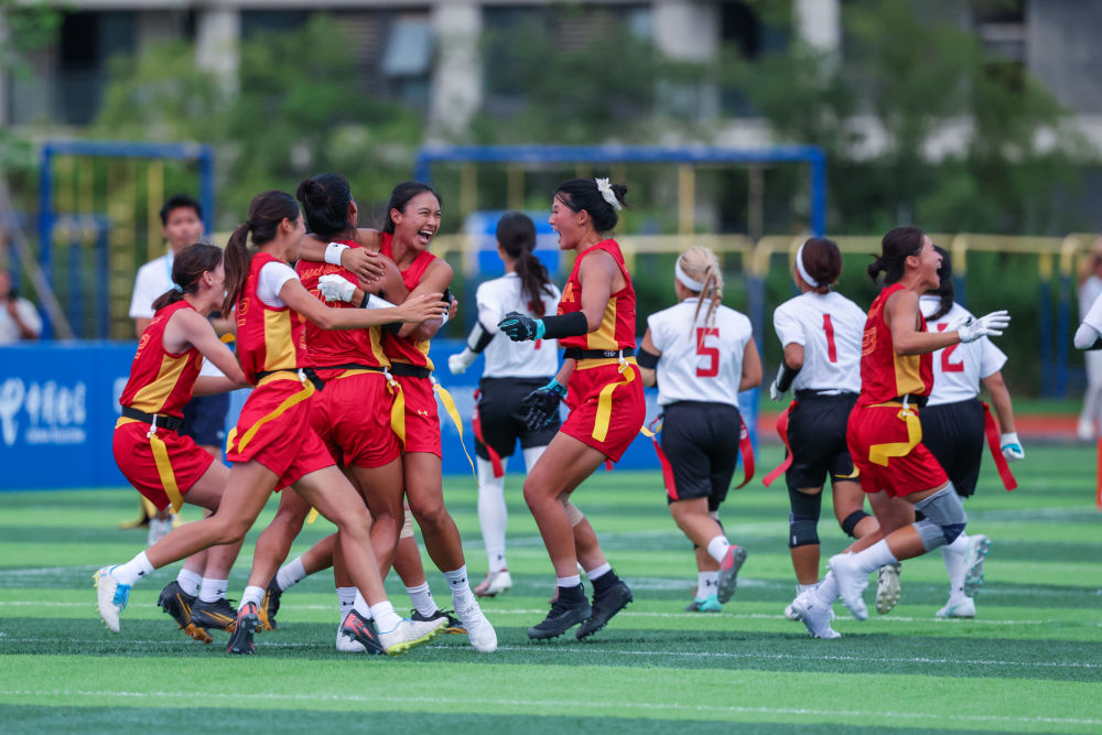 8月16日,在2025年成都世运会腰旗橄榄球女子5-8名安慰赛半决赛中,中国队战胜日本队。