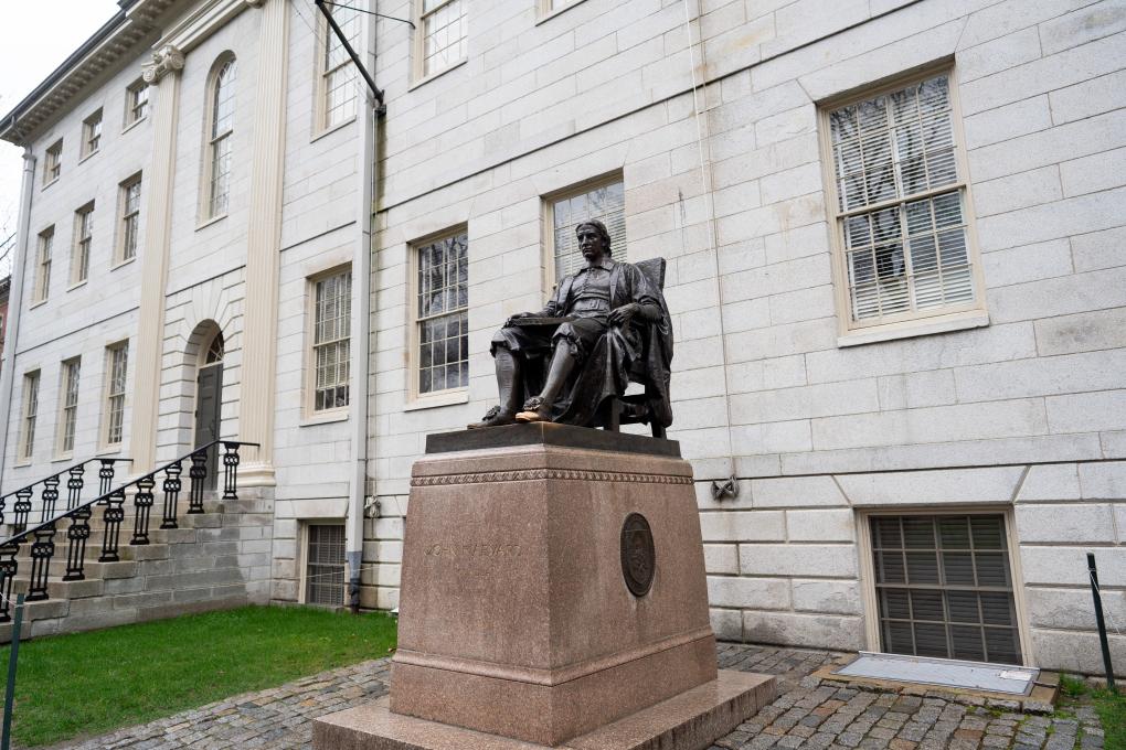 这张2024年4月20日在美国马萨诸塞州剑桥拍摄的资料照片显示的是哈佛大学内的哈佛大学创始人约翰·哈佛的雕塑。新华社记者刘杰摄