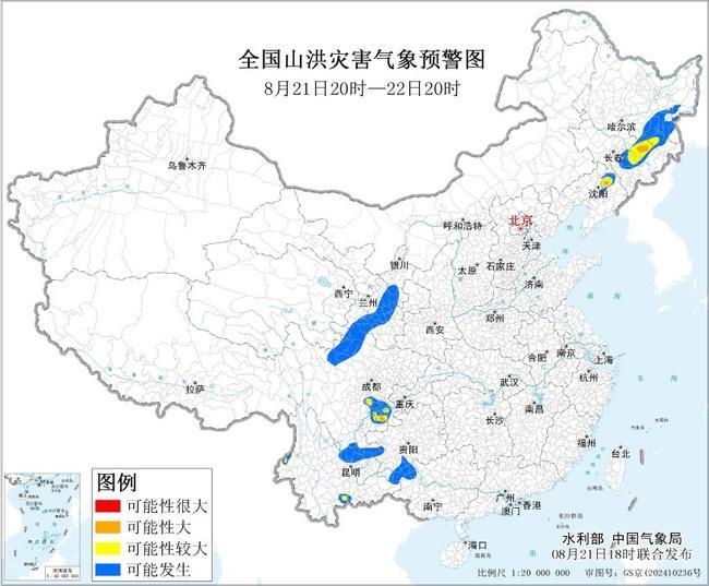 预计,8月21日20时至22日20时,辽宁东北部、吉林东部、黑龙江东南部、四川东南部、云南西部、南部和东北部等地部分地区发生山洪灾害可能性较大(黄色预警),其中,辽宁东北部、吉林东部、四川东南部局地发生山洪灾害可能性大(橙色预警)。其他地区也可能因局地短历时强降水引发山洪灾害,请各地注意做好实时监测、防汛预警和转移避险等防范工作。
