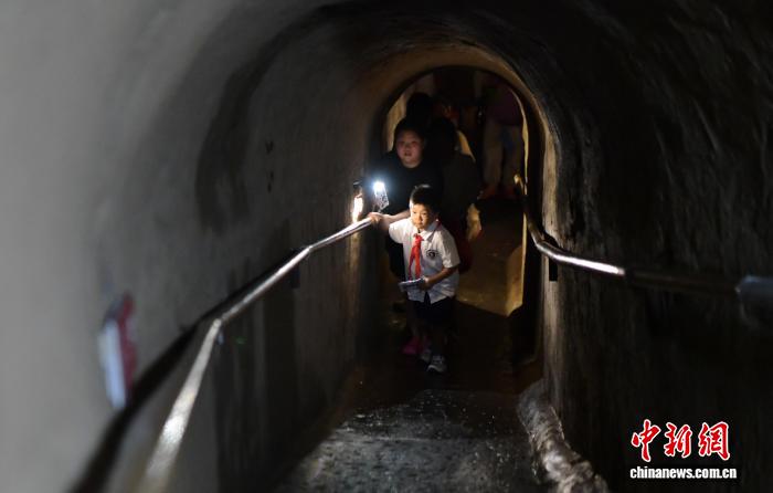 图为游客在狭窄的地道内体验行走,感受当年军民抗战的艰辛。中新社记者 翟羽佳 摄