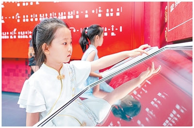 孩子们在百团大战纪念馆展厅内体验数字设备。
