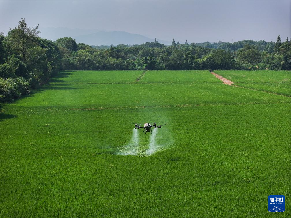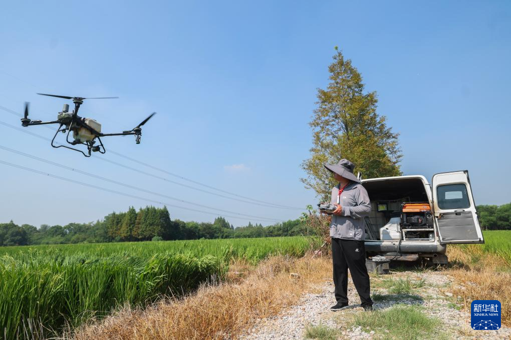 8月27日,工作人员操作农用无人机在虹星桥镇宋高村进行稻田喷洒作业,连片稻田有效提升了现代化机械的耕作效率。