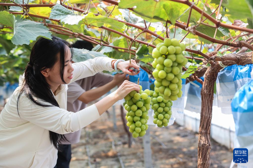8月27日,游客在虹星桥镇长兴轩乐诗农业发展有限公司的葡萄大棚内采摘葡萄。该公司是一家集高科技农业种植、休闲观光、电商销售于一体的现代化农业企业, 7-8月主要产出阳光玫瑰葡萄,占地120亩,亩产3000斤。