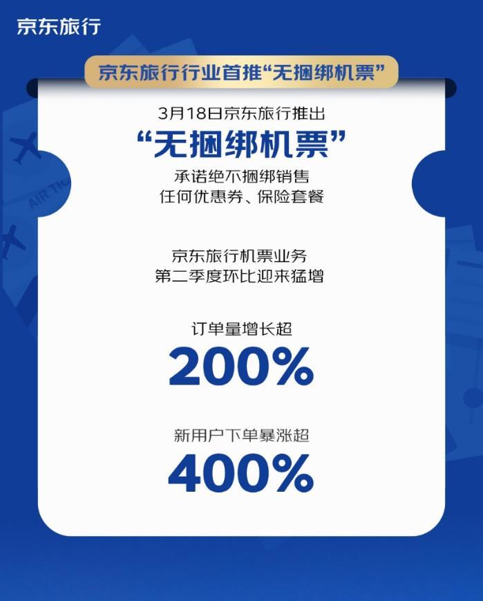 “无捆绑机票”受到用户广泛支持与认可,京东旅行官方数据显示,第二季度,京东旅行机票订单量环比增长超200%,机票下单新用户暴涨超400%。