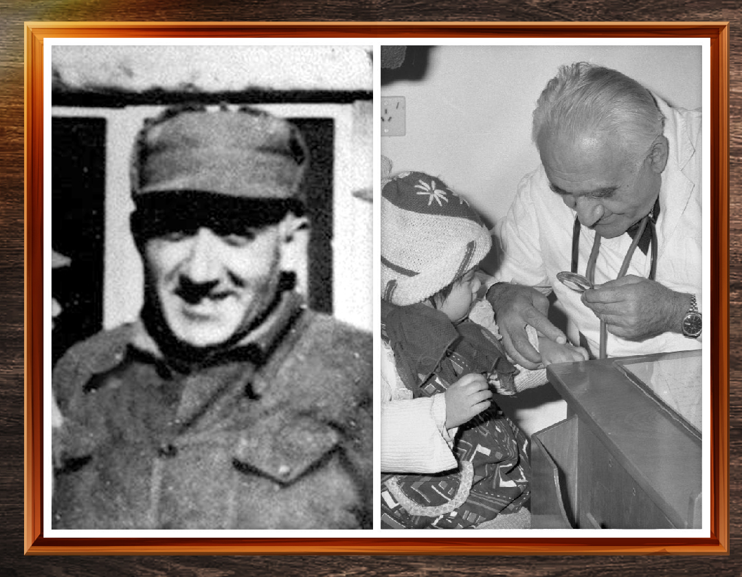 左图为马海德在延安窑洞前留影;右图为1980年,70岁高龄的马海德教授为小患者看病。