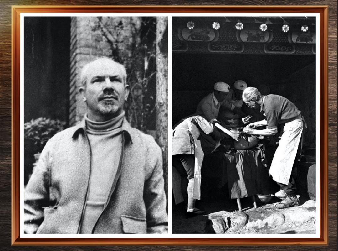 左图是1943年,米勒在延安国际和平医院任内科主任的资料照片;右图是1981年,米勒教授(中)和医生一起查病房。