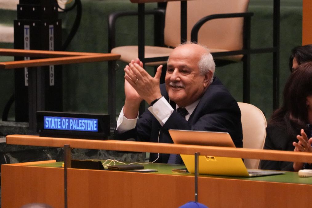 2024年9月18日,在位于纽约的联合国总部,巴勒斯坦常驻联合国观察员里亚德·曼苏尔在第十次联合国大会紧急特别会议投票后鼓掌庆祝。新华社/法新