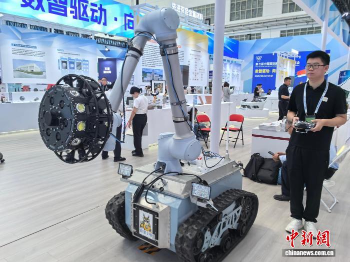 第七届中国国际新材料产业博览会展馆里,工作人员在展示防洪隧(涵)洞智能巡检机器人。 姜辉 摄