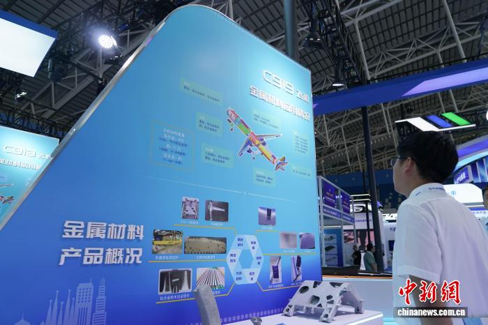 第七届中国国际新材料产业博览会展馆里,一名客商在观看C919飞机金属材料应用情况。 赵宇航 摄