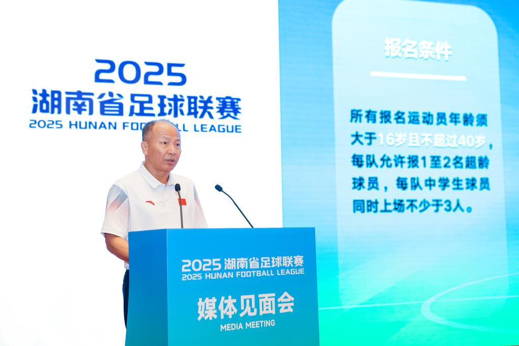 湖南省足球协会主席罗器宇在媒体见面会上介绍“湘超”联赛竞赛工作情况。