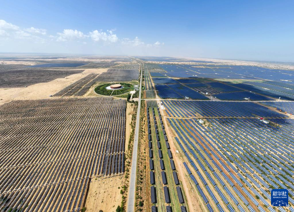 工人在库布其沙漠里的杭锦旗朔方新能源大基地安装光伏板(9月2日摄,无人机照片)。
