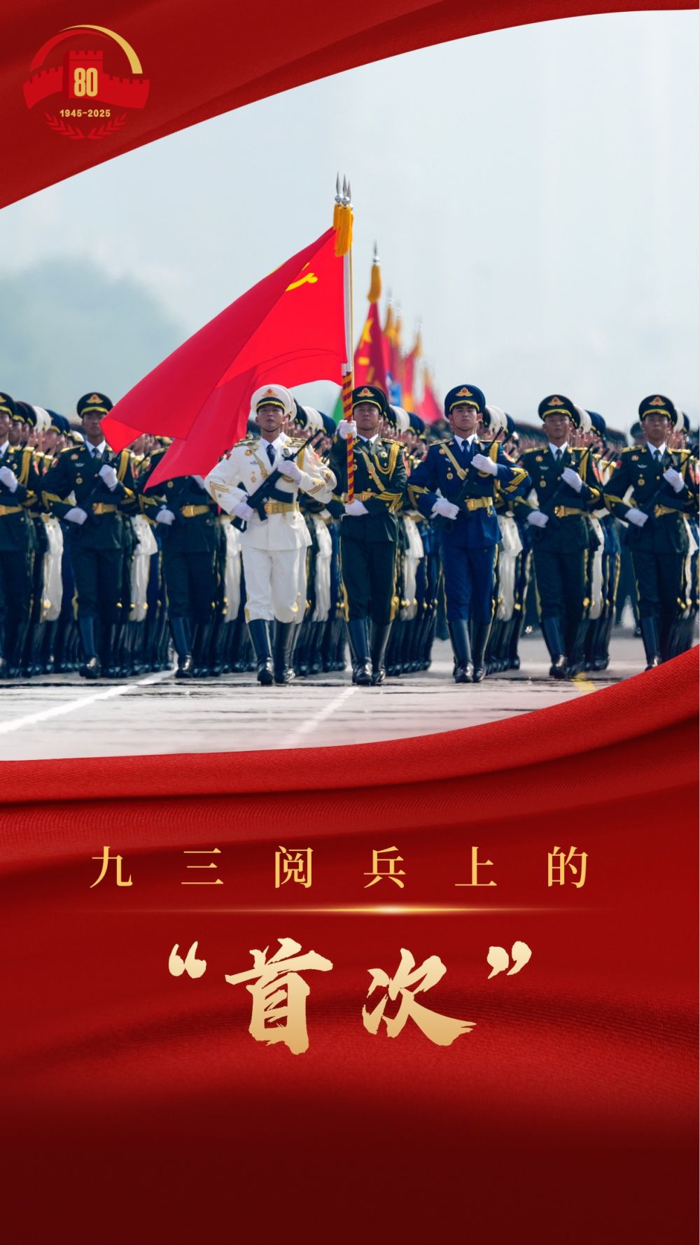 接受检阅的80面战旗,从全军各部队遴选确定,来自东、南、西、北、中五大战区,涵盖陆、海、空军和武警部队,由团、营、连三级功勋荣誉单位代表组成。